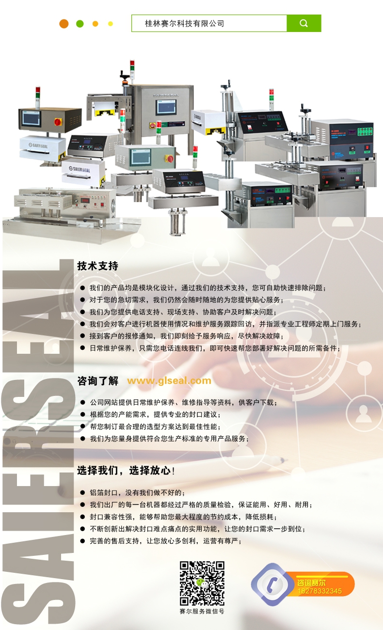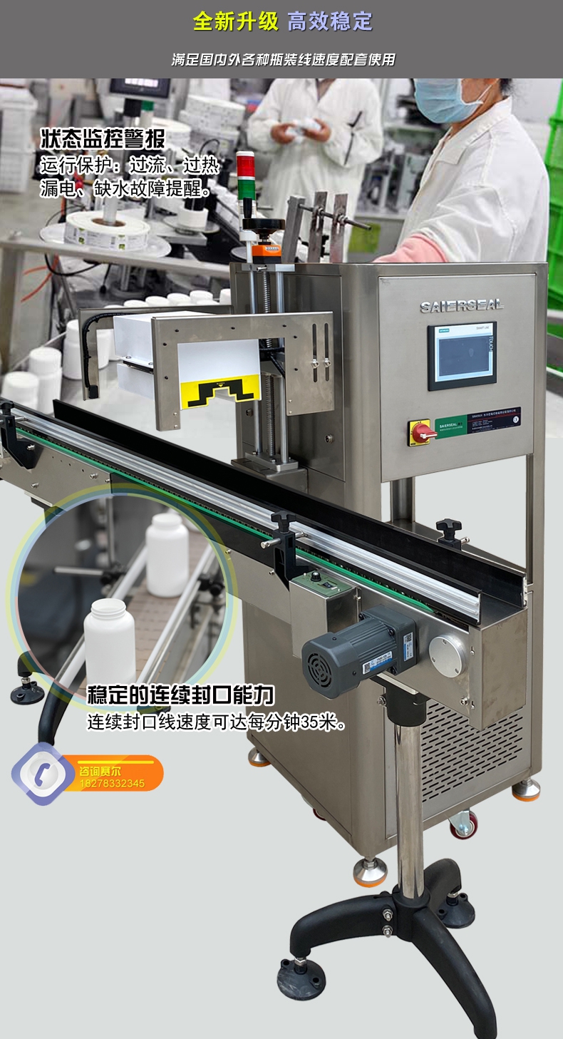 本機(jī)型封口通用性強(qiáng),配置先進(jìn),操作簡(jiǎn)單,滿足瓶裝線的連續(xù)封口要求,可針對(duì)不同化工物料的性狀特點(diǎn)進(jìn)行封口強(qiáng)度調(diào)節(jié),達(dá)到美觀牢固的產(chǎn)品密封目的;本型號(hào)參照美系進(jìn)口鋁箔封口機(jī)的技術(shù)指標(biāo),結(jié)合國(guó)內(nèi)化工廠普遍的封口需求進(jìn)行技術(shù)升級(jí),做到了穩(wěn)定性好、兼容性高、使用率強(qiáng),并具備抗磁干擾、耐腐防潮、漏電保護(hù)、異常報(bào)警、堵瓶檢測(cè)等多項(xiàng)先進(jìn)功能,是一款能達(dá)到嚴(yán)格封口,滿足自動(dòng)瓶裝線可靠封口的電磁感應(yīng)鋁箔封口機(jī)。