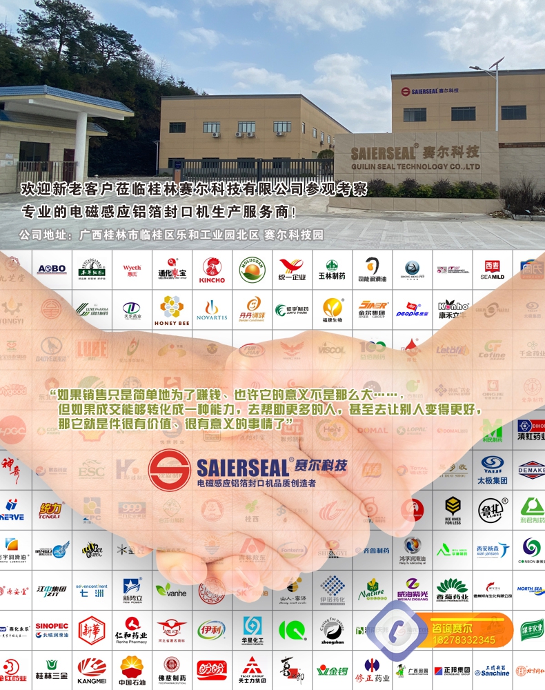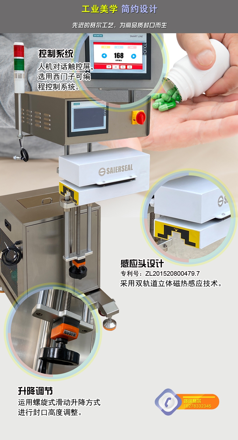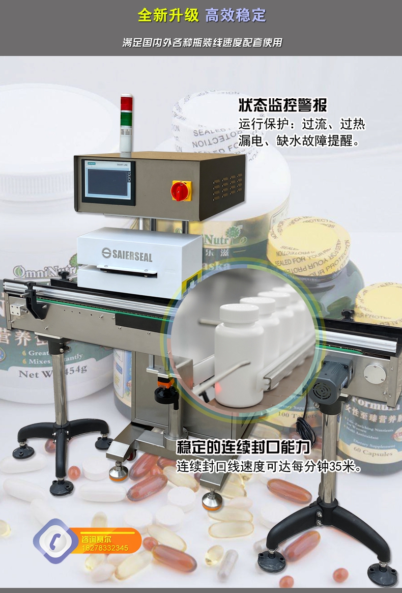本機(jī)型封口通用性強(qiáng),配置先進(jìn),操作簡(jiǎn)單,滿足瓶裝線的連續(xù)封口要求,可針對(duì)不同化工物料的性狀特點(diǎn)進(jìn)行封口強(qiáng)度調(diào)節(jié),達(dá)到美觀牢固的產(chǎn)品密封目的;本型號(hào)參照美系進(jìn)口鋁箔封口機(jī)的技術(shù)指標(biāo),結(jié)合國(guó)內(nèi)化工廠普遍的封口需求進(jìn)行技術(shù)升級(jí),做到了穩(wěn)定性好、兼容性高、使用率強(qiáng),并具備抗磁干擾、耐腐防潮、漏電保護(hù)、異常報(bào)警、堵瓶檢測(cè)等多項(xiàng)先進(jìn)功能,是一款能達(dá)到嚴(yán)格封口,滿足自動(dòng)瓶裝線可靠封口的電磁感應(yīng)鋁箔封口機(jī)。