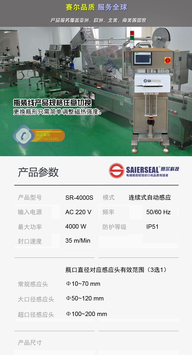 SR-4000S水冷式電磁感應(yīng)鋁箔封口機(jī)應(yīng)用于瓶口密封,可防止產(chǎn)品遭篡改,保持藥物新鮮,防止被盜,并在運(yùn)輸時(shí)保護(hù)藥劑或藥粉不外泄。