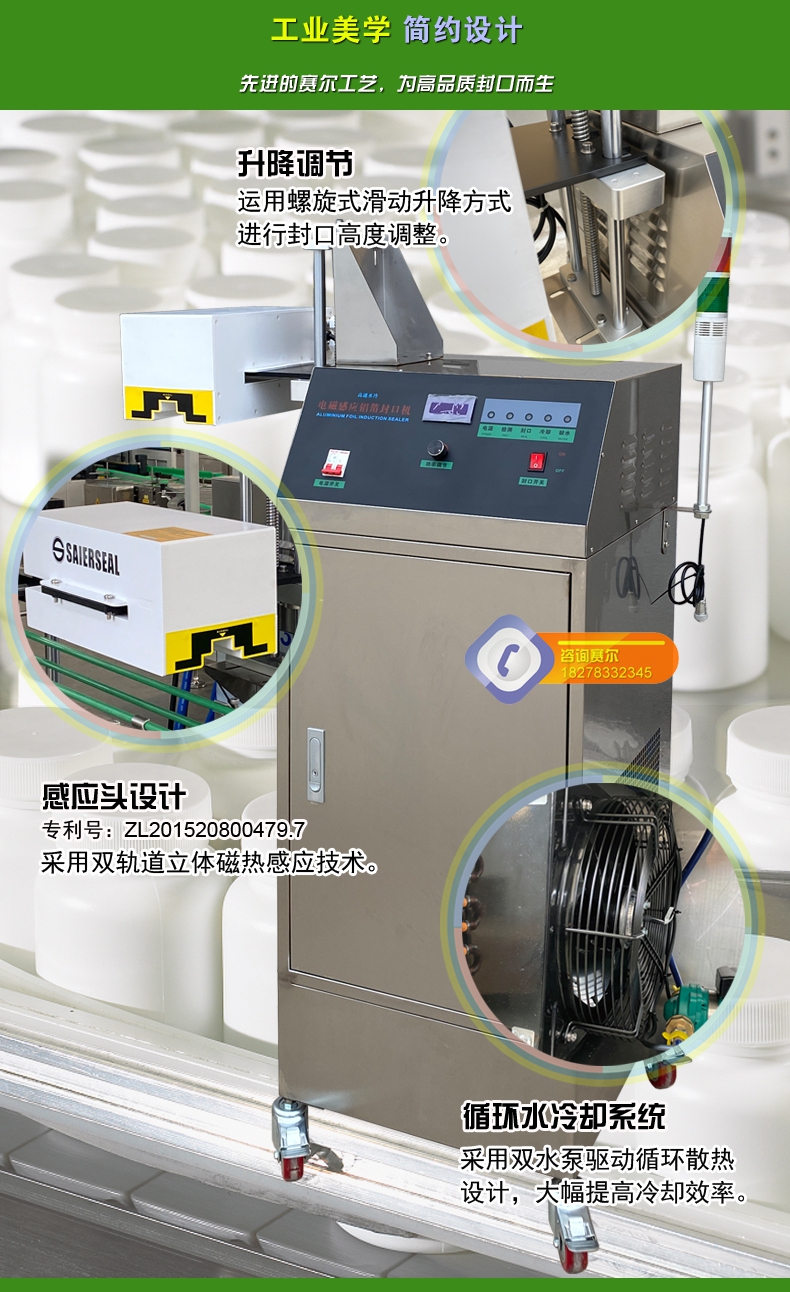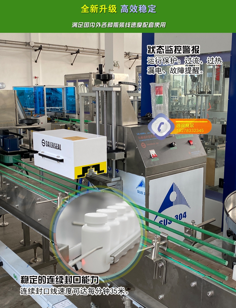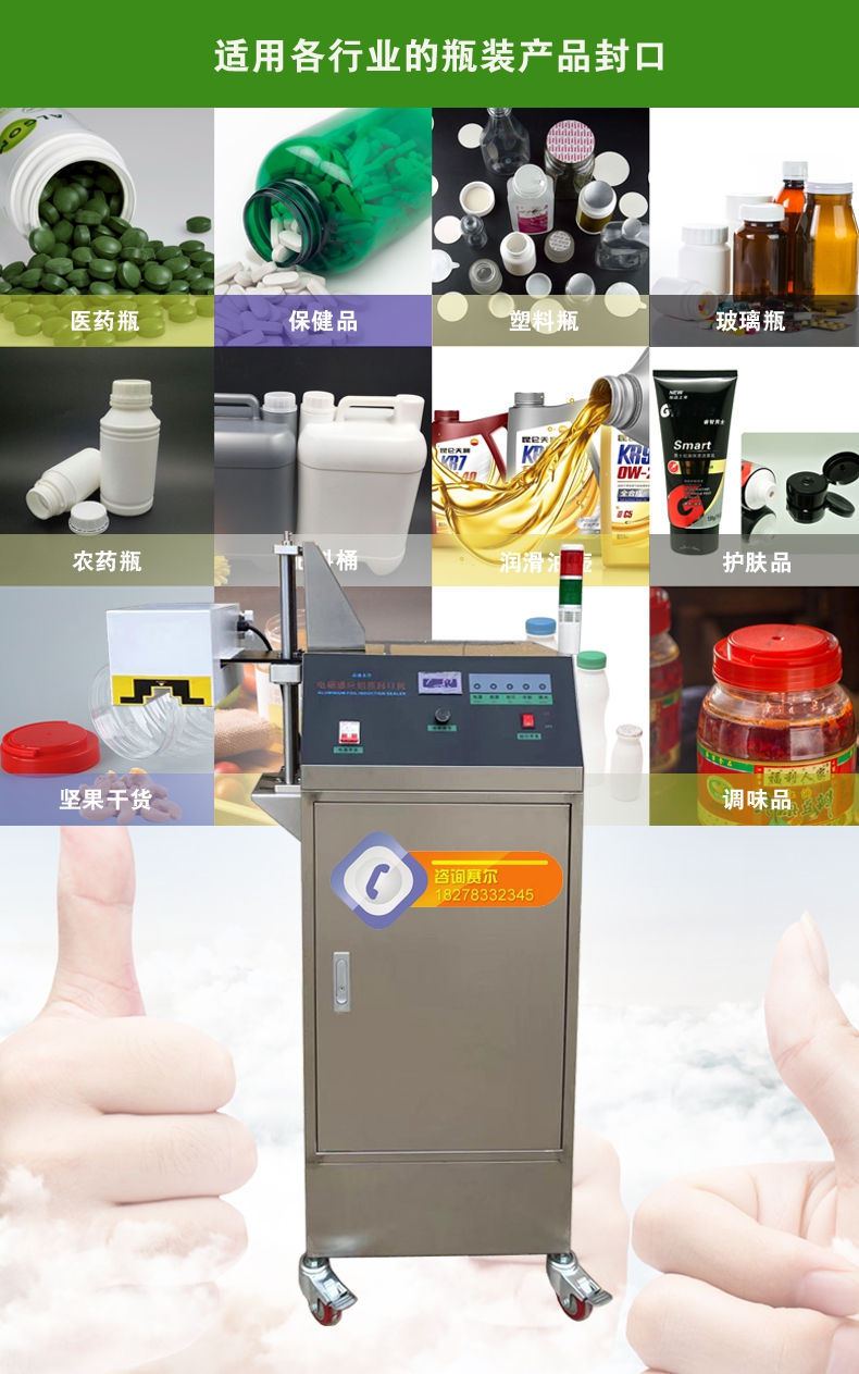 本機(jī)型封口通用性強(qiáng),配置先進(jìn),操作簡單,滿足瓶裝線的連續(xù)封口要求,可針對不同化工物料的性狀特點(diǎn)進(jìn)行封口強(qiáng)度調(diào)節(jié),達(dá)到美觀牢固的產(chǎn)品密封目的;本型號參照美系進(jìn)口鋁箔封口機(jī)的技術(shù)指標(biāo),結(jié)合國內(nèi)化工廠普遍的封口需求進(jìn)行技術(shù)升級,做到了穩(wěn)定性好、兼容性高、使用率強(qiáng),并具備抗磁干擾、耐腐防潮、漏電保護(hù)、異常報警等多項(xiàng)先進(jìn)功能,是一款能達(dá)到嚴(yán)格封口,滿足自動瓶裝線可靠封口的電磁感應(yīng)鋁箔封口機(jī)。